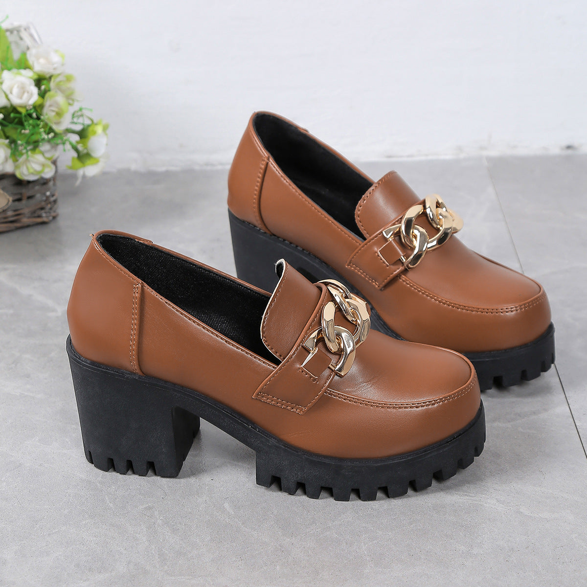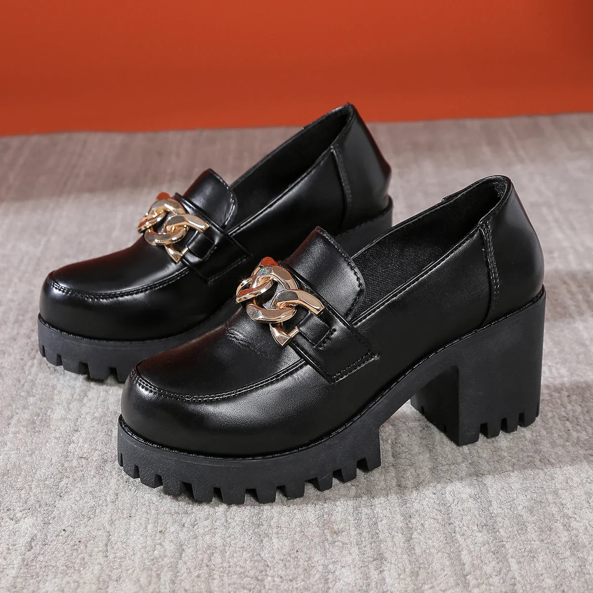 Crafted from smooth premium leather with a bold gold chain accent, these platform loafers deliver cushioned insoles and a commanding presence that turns every step into a statement.
