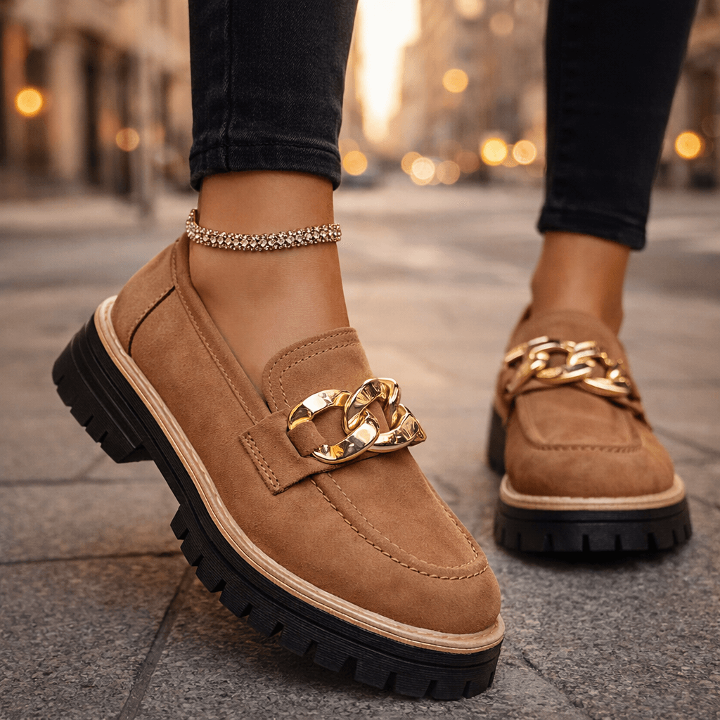 Designed with soft suede and an eye-catching gold chain detail, these loafers pair cushioned insoles with a rugged platform sole for all-day comfort and an effortlessly put-together look.
